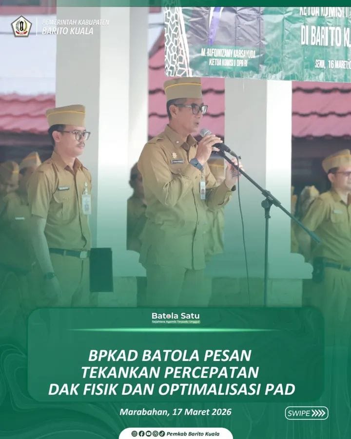 MARABAHAN, kompaspemburukeadilan.com – Pemerintah Kabupaten Barito Kuala (Pemkab Batola) kembali melaksanakan rutinitas apel pagi bagi Aparatur Sipil Negara (ASN) di halaman Kantor Bupati Barito Kuala pada Senin (16/03).