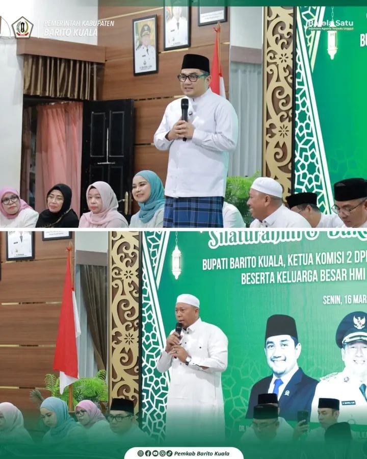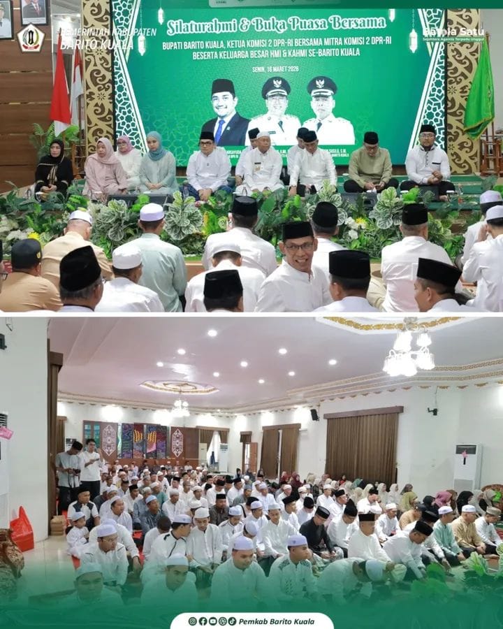 BARITO KUALA, kompaspemburukeadilan.com – Pemerintah Kabupaten Barito Kuala (Batola) menggelar kegiatan Safari Ramadhan yang dirangkaikan dengan silaturahmi dan buka puasa bersama keluarga besar HMI & KAHMI se-Batola di Aula Selidah, Senin (16/03). Kegiatan ini dihadiri langsung oleh Bupati Batola, H. Bahrul Ilmi, beserta istri, serta Ketua Komisi II DPR RI, M. Rifqinizamy Karsayuda, yang juga didampingi istri.