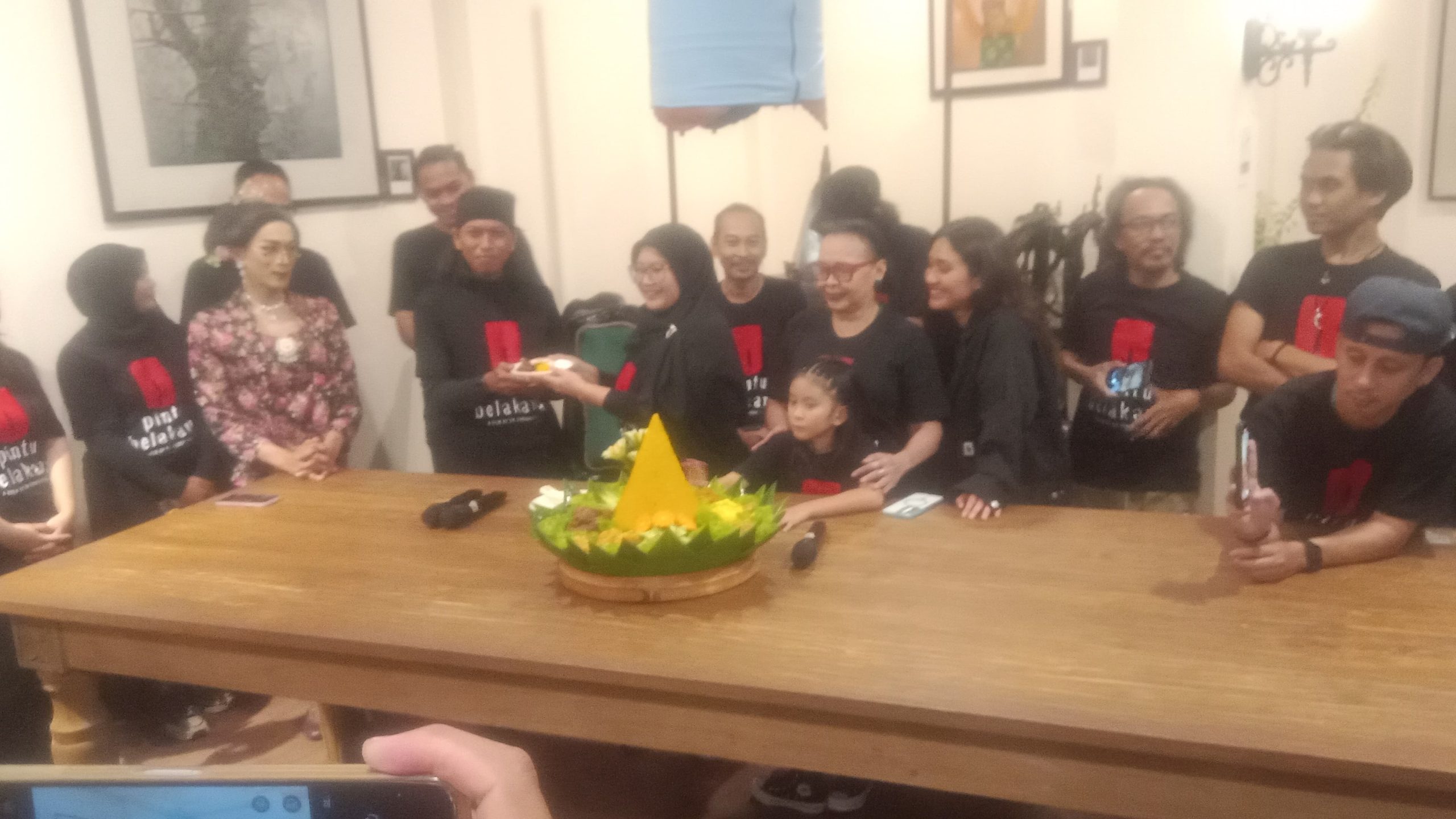 Kru dan tim produksi berfoto bersama saat syukuran pemotongan tumpeng, Minggu sore (22/2/2026). Produser Rizka Shakira, CEO BCS (hitam berjilbab) bersama para pemain dan tim Bintang Cahaya Sinema memperlihatkan kekompakan dan optimisme menjelang penggarapan film horor psikologis ini.