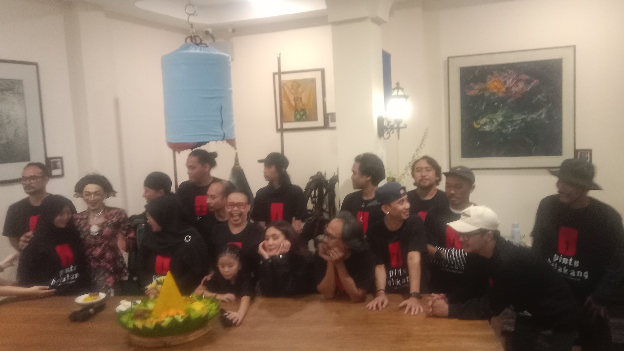 Kru dan tim produksi Pintu Belakang berfoto bersama saat syukuran pemotongan tumpeng, tampak Produser Dewi Novita (hitam berjilbab) bersama para pemain dan tim Bintang Cahaya Sinema, menunjukkan kekompakan dan optimisme menjelang penggarapan film horor psikologis ini. Minggu Sore, (22/2/2026)./R45/Ags.w