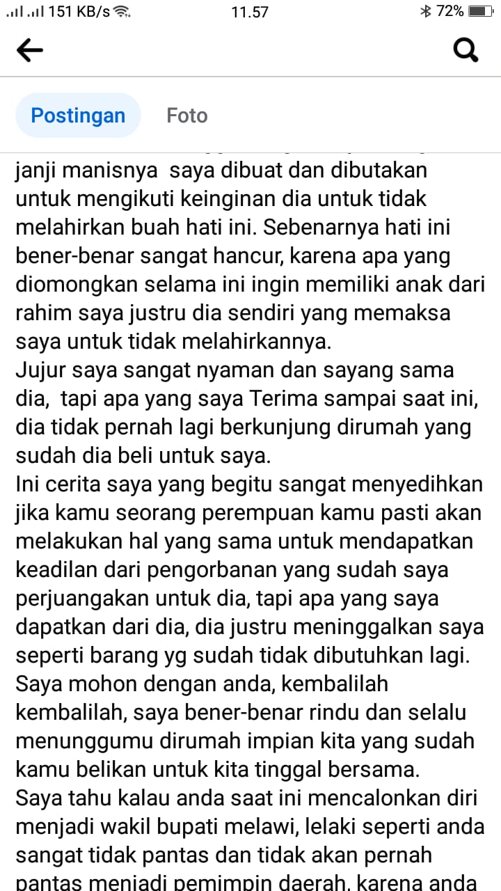 “Sebenarnya hati ini bener-benar sangat hancur, karena apa yang diomongkan selama ini ingin memiliki anak dari rahim saya justru dia sendiri yang memaksa saya untuk tidak melahirkannya. Jujur saya sangat nyaman dan sayang sama dia,  tapi apa yang saya Terima sampai saat ini, dia tidak pernah lagi berkunjung dirumah yang sudah dia beli untuk saya,” lanjut dia dalam akun Facebook miliknya.