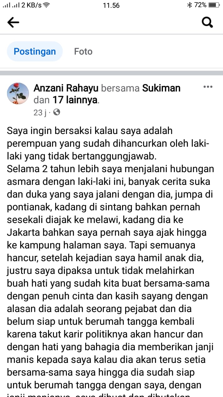 “Selama (2) dua tahun lebih saya menjalani hubungan asmara dengan laki-laki ini, banyak cerita suka dan duka yang saya jalani dengan dia, jumpa di pontianak, kadang di Sintang bahkan pernah sesekali diajak ke Melawi, kadang dia ke Jakarta bahkan saya pernah saya ajak hingga ke kampung halaman saya. Tapi semuanya hancur, setelah kejadian saya hamil anak dia, justru saya dipaksa untuk tidak melahirkan buah hati yang sudah kita buat bersama-sama dengan penuh cinta dan kasih sayang dengan alasan dia adalah seorang pejabat dan dia belum siap untuk berumah tangga kembali karena takut karir politiknya akan hancur dan dengan hati yang bahagia dia memberikan janji manis kepada saya kalau dia akan terus setia bersama-sama saya hingga dia sudah siap untuk berumah tangga dengan saya, dengan janji manisnya  saya dibuat dan dibutakan untuk mengikuti keinginan dia untuk tidak melahirkan buah hati ini.” tulis Anzani Rahayu dalam akun Facebook miliknya 22 jam yang lalu, Rabu (13/11/2024).